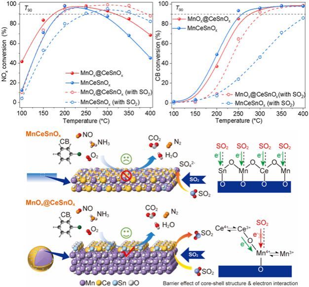 Recently, the team of Environmental Functional Materials and Pollution Control from the School of Biology and Environmental Engineering (including the Interdisciplinary Research Academy) of our university published a research paper titled “MnOx@CeSnOx with core-shell structure and electronic interaction boosting sulfur tolerance in simultaneous removal of NOx and chlorobenzene” (https://doi.org/10.1016/j.apcatb.2025.125868) in the top international journal Applied Catalysis B: Environment and Energy (Impact Factor IF = 21.1, Chinese Academy of Sciences Category 1, TOP). Professor Pan Hua, the team leader, served as the corresponding author. Dr. Zhang Xixiong, a team member, was the first author. Ling Xin, a jointly trained postgraduate student, and Associate Professor Xue Qingquan, a team member, were co-first authors. Professor Chen Jun from our university and Professor He Chi from the collaborating institution Xi’an Jiaotong University were co-corresponding authors. Our university is the first affiliation and corresponding institution for this paper, with Xi’an Jiaotong University as the co-corresponding institution. This marks the team’s second research paper published in this journal this year, signifying a series of important advancements for our university in the field of environmental catalysis.